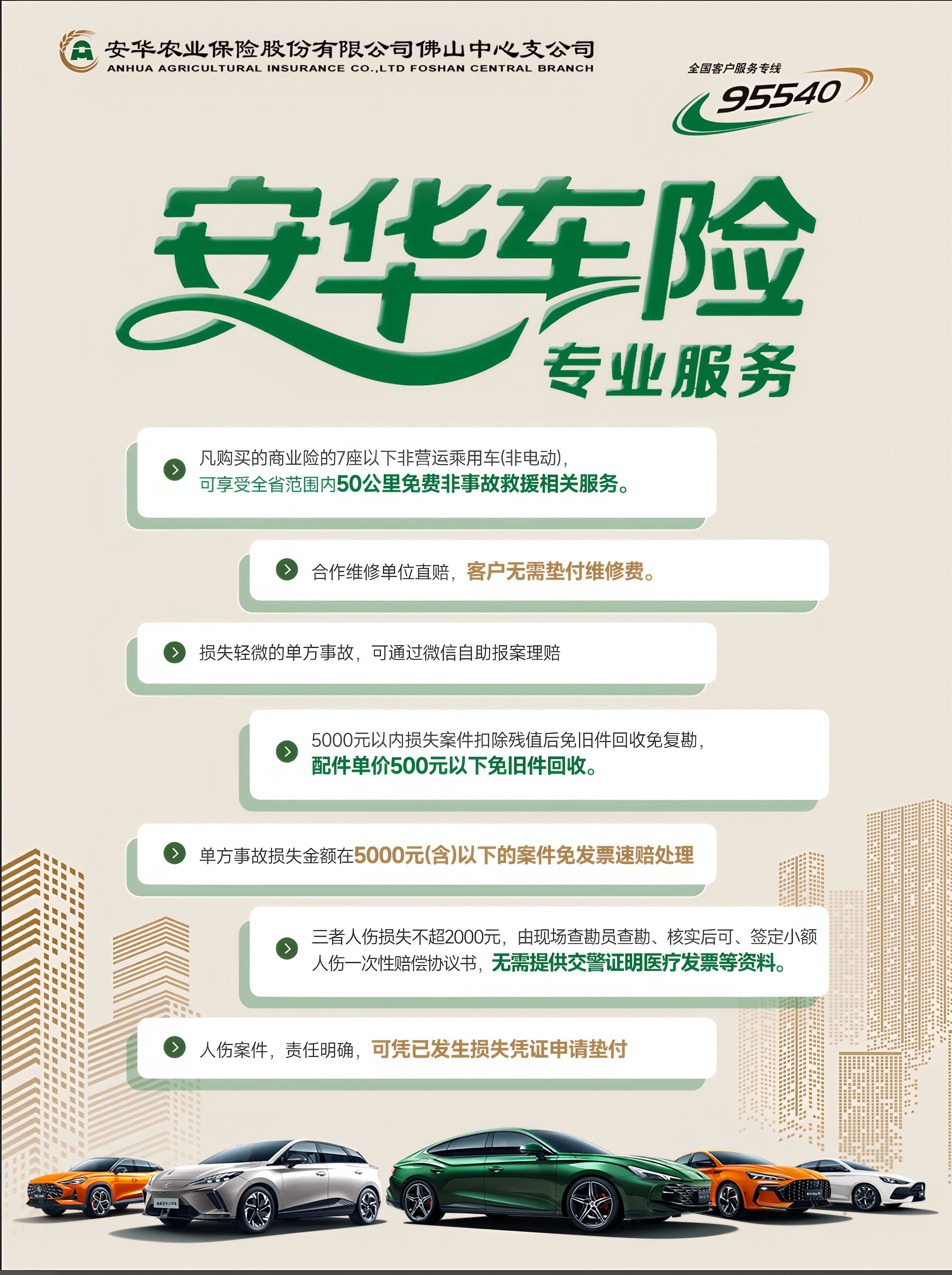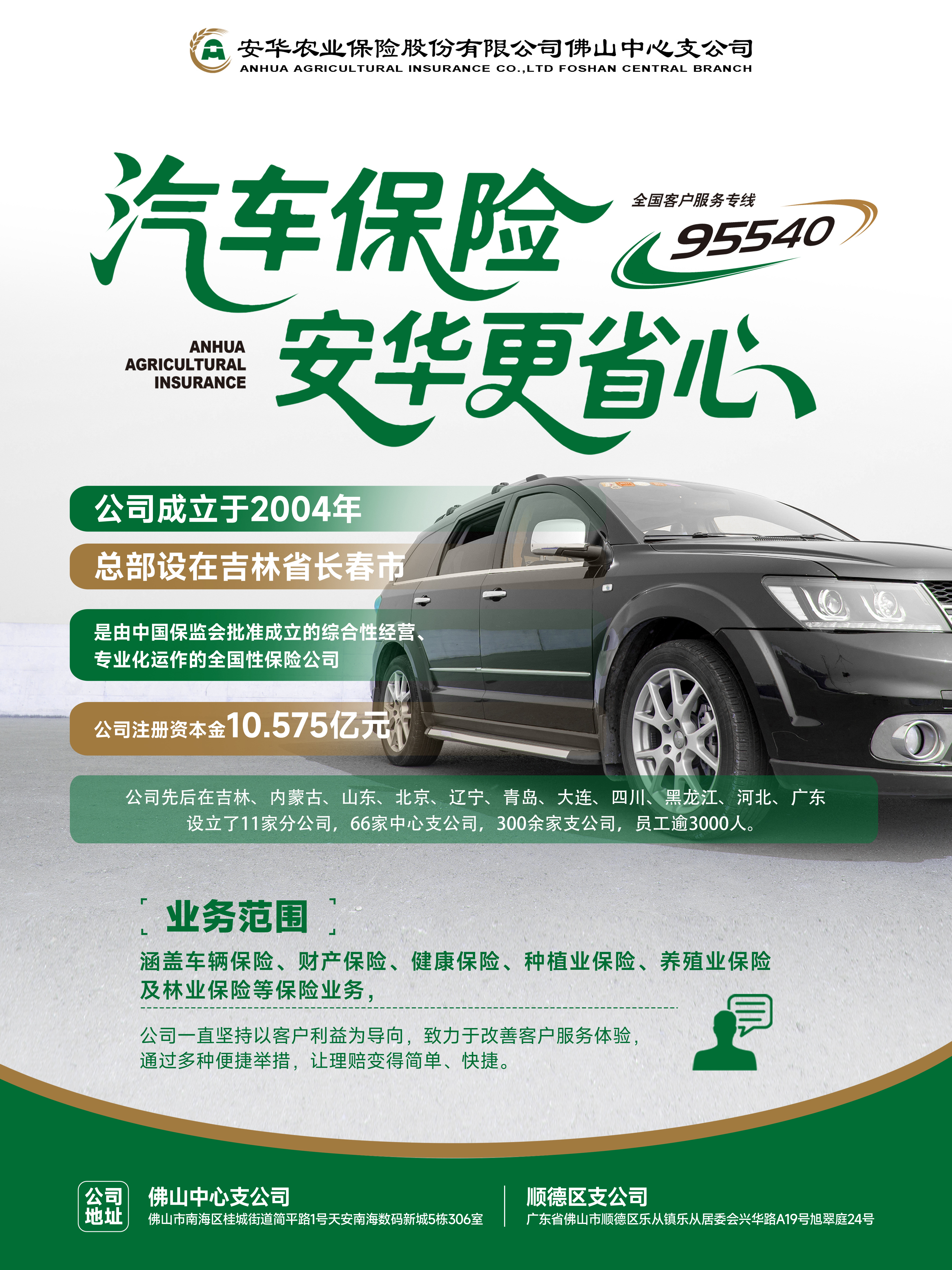 佛山中心支公司秉承总公司“根植农村、安身农业、贴近农民、服务三农”的企业宗旨,不仅服务于农业保险领域,还积极拓展车险业务。其车险特色服务亮点纷呈:提供 7×24 小时全天候服务受理,确保车主在任何时间都能获得及时帮助;快速现场查勘,市内 30 分钟、市郊 60 分钟内迅速到达,高效定损;小额案件实现快赔,赔案损失金额小于五千元时,资料齐全后两个工作日内即可完成赔付。此外,公司还提供异地客户服务,让车主无论身处何地,都能享受到便捷、贴心的保险服务。这些特色服务不仅提升了服务效率,也彰显了安华农业保险对客户需求的深入理解和高效响应,为车主的行车安全保驾护航。